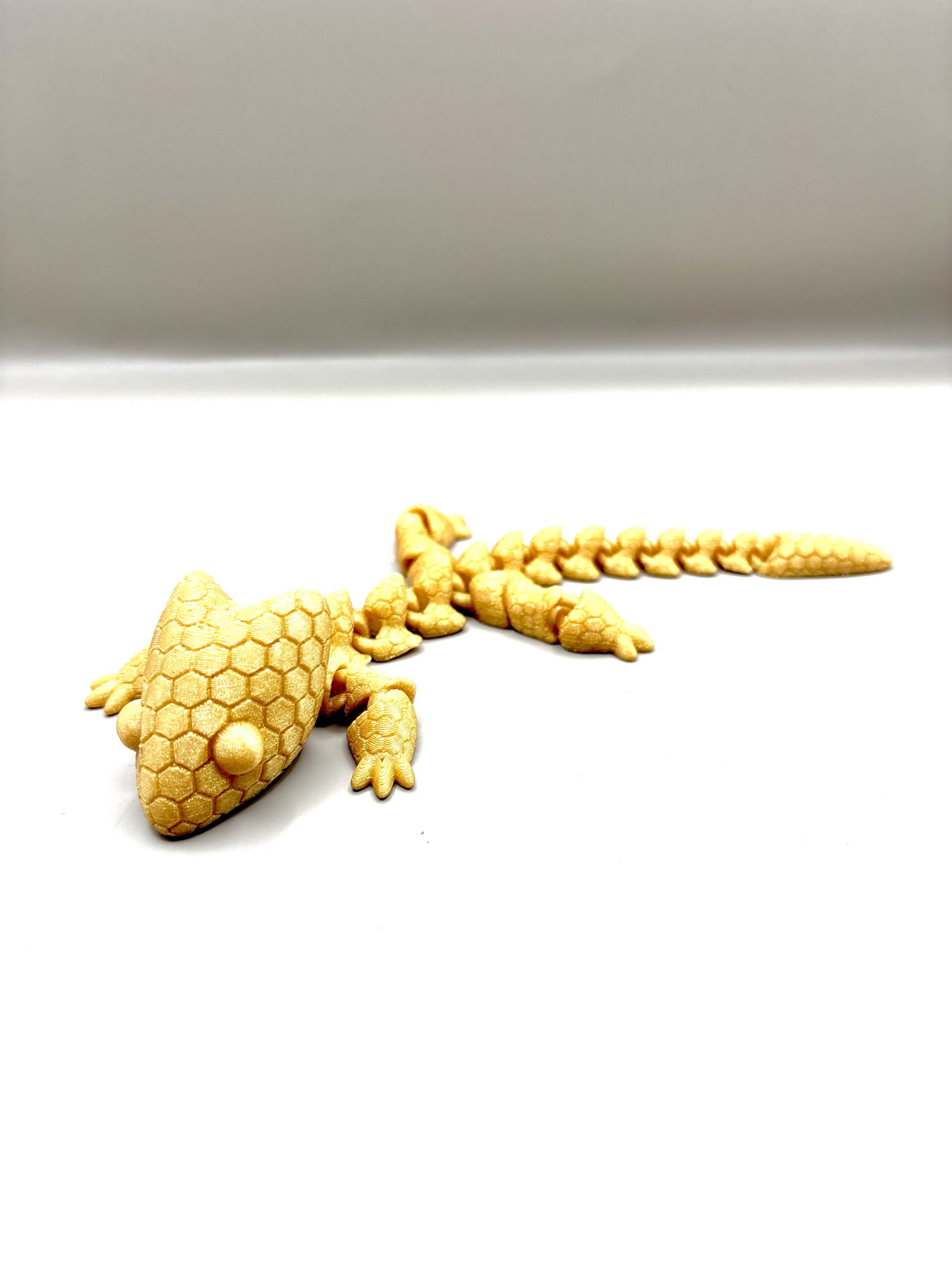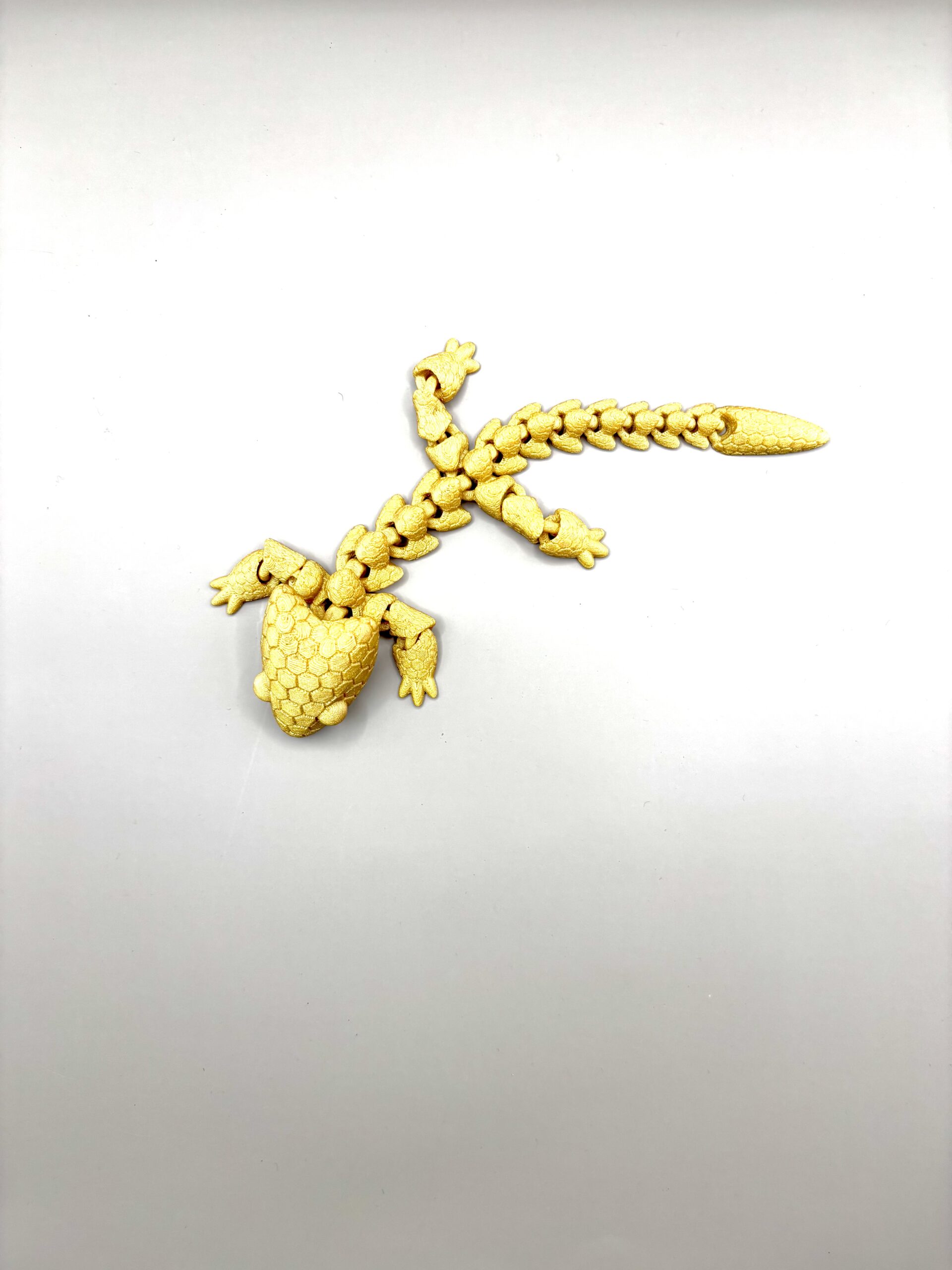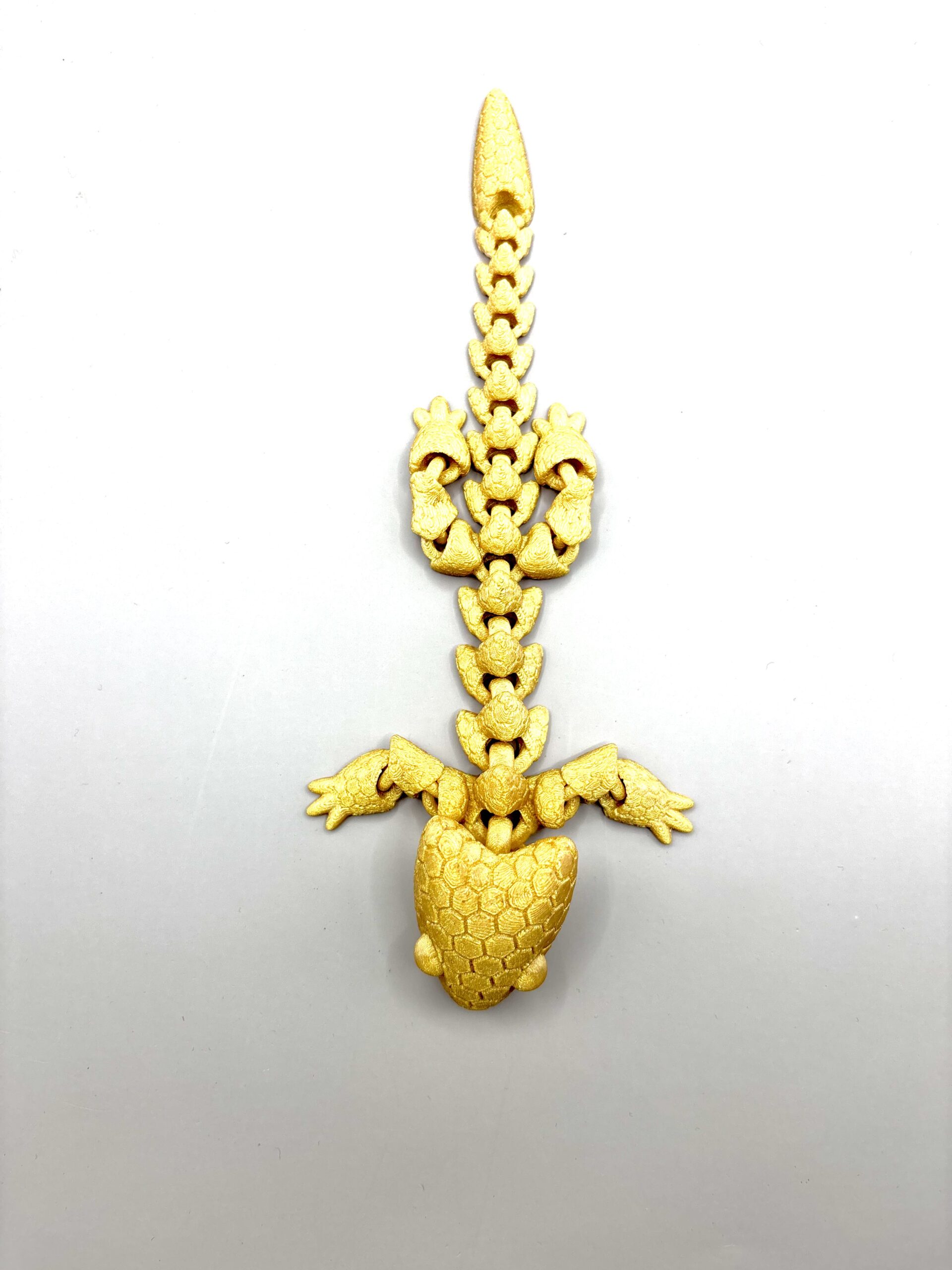 Articulated gold dragon is a unique 3D printed Stress relief toy. Designed with fully movable joints for a realistic and satisfying experience. Its flexible body allows smooth motion, making it perfect as a desk toy, collectible, or gift. The detailed design and metallic gold finish give it a premium look that stands out in any workspace or display. Lightweight, durable, and fun to interact with every day.